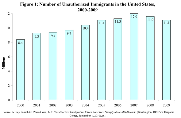 - According to estimates released in September 2010 by the Pew Hispanic Center, the number of unauthorized immigrants in the United States increased from roughly 8.4 million in 2000 to a high of 12.0 million in 2007, then declined to 11.6 million in 2008 and 11.1 million in 2009 {Figure 1}. The apparent decline between 2008 and 2009 is inconclusive because it falls within the estimates’ margin of error.