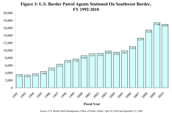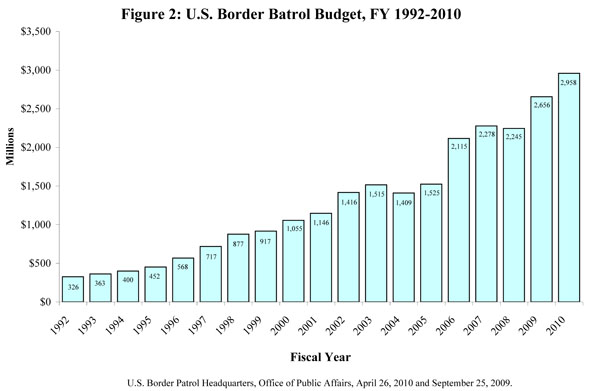 - The annual budget of the U.S. Border Patrol stood at $3.0 billion in Fiscal Year (FY) 2010—a nine-fold increase since FY 1992 {Figure 2}. The number of Border Patrol agents stationed along the southwest border with Mexico grew to 16,974 in FY 2010—a nearly five-fold increase since FY 1992 {Figure 3}.