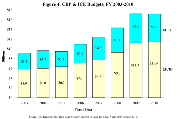 - The combined budgets of U.S. Customs and Border Protection (CBP), the parent agency of the Border Patrol within DHS, and U.S. Immigration and Customs Enforcement (ICE), the DHS interior-enforcement counterpart to CBP, grew from $9.1 billion in FY 2003 to $17.2 billion in FY 2010 {Figure 4}.