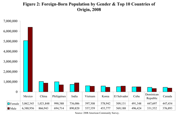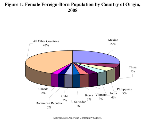 - Mexico accounted for more than one-quarter (27 percent) of all foreign-born females in 2008, followed by China and the Philippines at 5 percent each {Figure 1}.