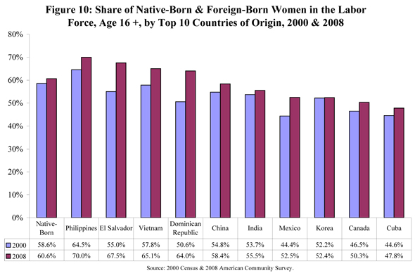 - The largest increases in labor-force participation between 2000 and 2008 occurred among women from the Dominican Republic, El Salvador, and Mexico {Figure 10}.