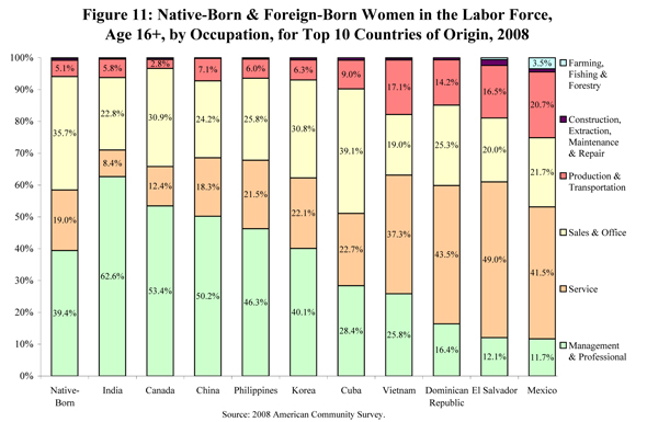 - More than three-fifths of immigrant women from India who were in the labor force in 2008 worked in management and professional occupations (62.6 percent), compared to two-fifths of native-born women (39.4 percent) {Figure 11}.