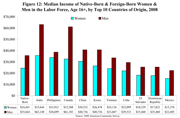 - Immigrant women in the labor force had a median annual income of $21,182 in 2008, compared to $24,441 for native-born women and $29,533 for foreign-born men.