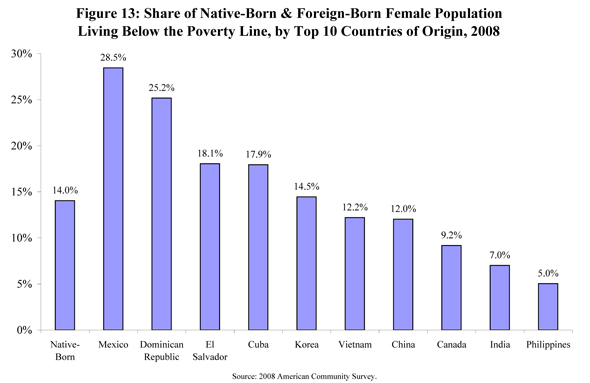 - Among the top 10 countries of origin, female immigrants from the Philippines had the lowest poverty rate in 2008 (5.0 percent) {Figure 13}.