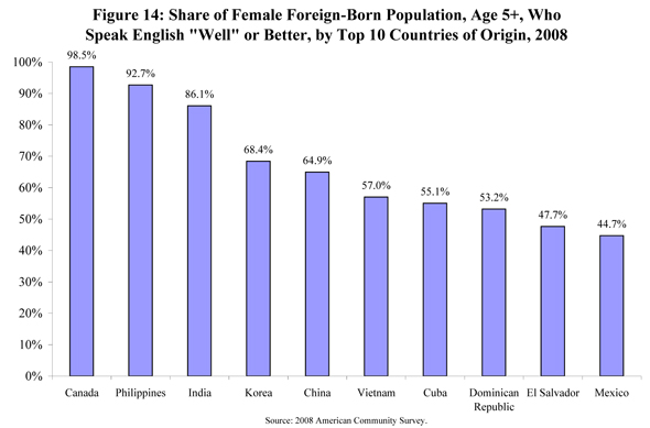 - Fewer than half of female immigrants from Mexico and El Salvador spoke English “well” or better in 2008 {Figure 14}.