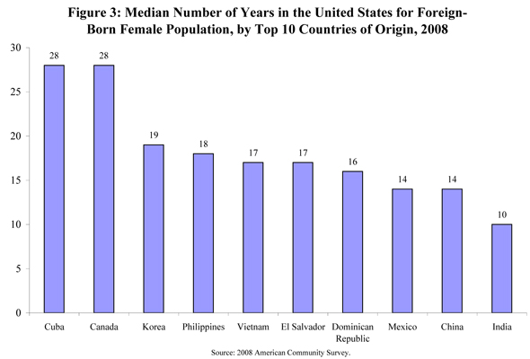 - The median number of years spent in the United States among foreign-born females varied widely according to country of origin, ranging from only 10 years among those from India to 28 years among those from Cuba and Canada {Figure 3}.