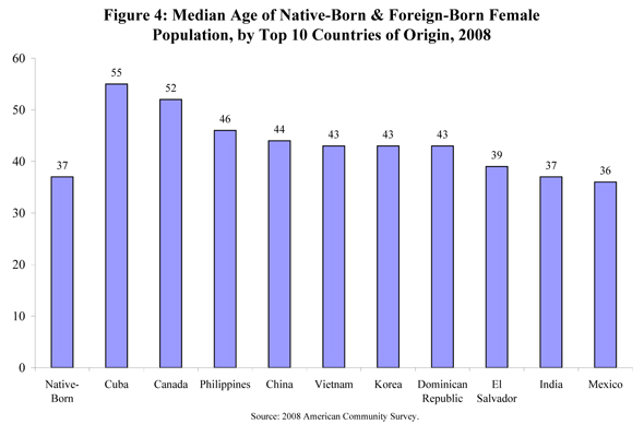 - The median age of foreign-born females varied widely according to country of origin, ranging from 36 among those from Mexico to 55 among those from Cuba {Figure 4}.