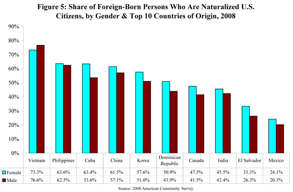 - Nearly half (46.4 percent) of female immigrants were naturalized U.S. citizens in 2008, compared to 39.7 percent of male immigrants.