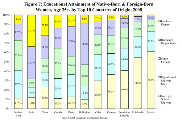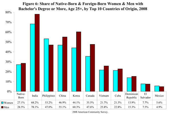 - The educational attainment of foreign-born women in 2008 varied widely according to country of origin. For instance, nearly seven out of ten immigrant women from India (68.2 percent) had a bachelor’s degree or more education, compared to slightly more than one-quarter (27.1 percent) of native-born women and only one-in-twenty immigrant women from Mexico (5.6 percent) {Figure 6}.