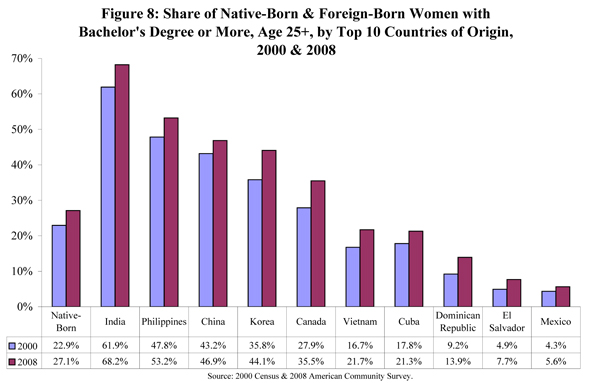 - The share of immigrant women with a bachelor’s degree or more education increased for all top 10 countries of origin between 2000 and 2008 {Figure 8}.