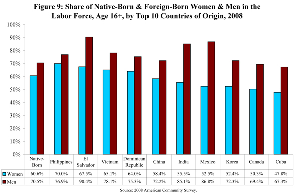 - On average, 57.1 percent of foreign-born women were in the labor force in 2008, compared to 60.6 percent of native-born women and 80.6 percent of foreign-born men.