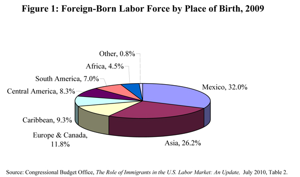 - According to the CBO’s analysis, nearly one-third (32.0 percent) of all foreign-born workers were from Mexico as of 2009, while more than one-quarter (26.2 percent) came from Asian countries {Figure 1}.