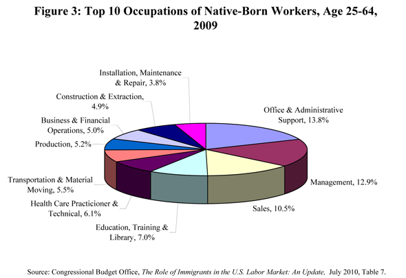 - The top occupation for native-born workers age 25-64 was office and administrative support in 2009, accounting for 13.8 percent of the total native-born labor force, followed by management (12.9 percent); sales (10.5 percent); and education, training, and library occupations (7.0 percent) {Figure 3}.