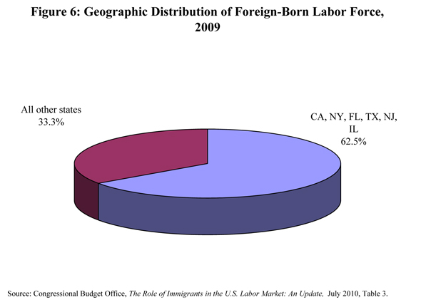 - 62.5% of foreign-born workers lived in only six states in 2009: California, New York, Florida, Texas, New Jersey, and Illinois {Figure 6}. In comparison, only 34.6 percent of native-born workers lived in those states {Figure 7}.
