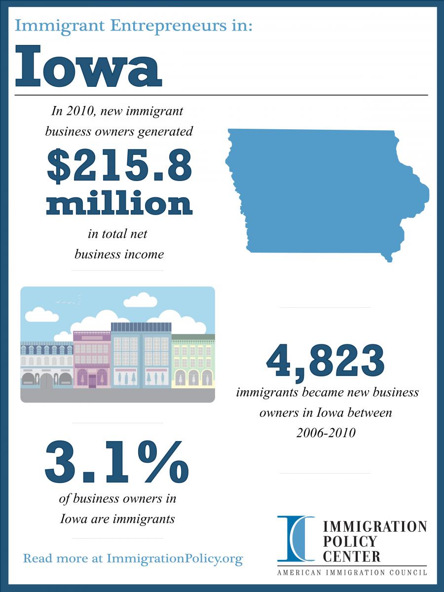 - From 2006 to 2010, there were 4,823 new immigrant business owners in Iowa, and in 2010, 3.1 percent of all business owners in the state were foreign-born.