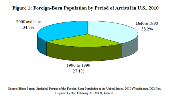 - The majority of immigrants are not newcomers to this country. As of 2010, just under two-fifths (38.2 percent) of the nation’s 39.9 million immigrants had come to the United States before 1990, while more than a one-quarter (27.1 percent) had arrived during the 1990s. Just over one-third (34.7 percent) had come in 2000 or later {Figure 1}.