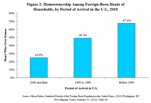 - The longer immigrants are here, the more likely they are to own a home. As of 2010, only one-quarter (24.9 percent) of foreign-born heads of households who arrived in the country in 2000 or later owned their own home. But this rose to nearly half (49.1 percent) of those who arrived during the 1990s and more than two-thirds (67.4 percent) of those who arrived before 1990 {Figure 2}.