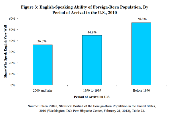 - The longer immigrants are here, the more likely they are to speak English well. As of 2010, a little over one-third (36.3 percent) of immigrants who had arrived in the country in 2000 or later spoke English “very well” or spoke only English at home. That share rose to more than two-fifths (44.9 percent) among those you arrived during the 1990s, and nearly three-fifths (56.3 percent) among those who arrived before 1990 {Figure 3}.
