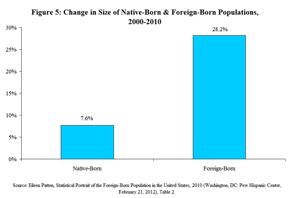 - Immigrants have become a driving force in the growth of the U.S. population, which is a key component of growth in the labor force. Between 2000 and 2010, the size of the foreign-born population increased by 28.2 percent, while the native-born population grew by only 7.6 percent {Figure 5}.