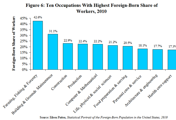 - Immigrants fill vital roles in both highly skilled and less-skilled occupations. As of 2010, the foreign-born accounted for more than two-fifths (42.6 percent) of workers in farming, fishing, and forestry; nearly one-third (31.1 percent) in building and grounds cleaning and maintenance; and more than one-fifth in construction (22.9 percent), production occupations (22.4 percent); computer and mathematical occupations (22.2 percent), life, physical, and social sciences (21.2 percent), and food preparation and serving (20.5 percent) {Figure 6}. Immigrants accounted for more than one-seventh (15.6 percent) of the U.S. labor force overall.