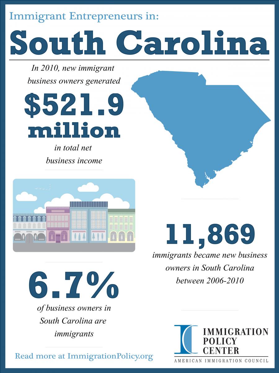- From 2006 to 2010, there were 11,869 new immigrant business owners in South Carolina, and in 2010, 6.7 percent of all business owners in South Carolina were foreign-born.