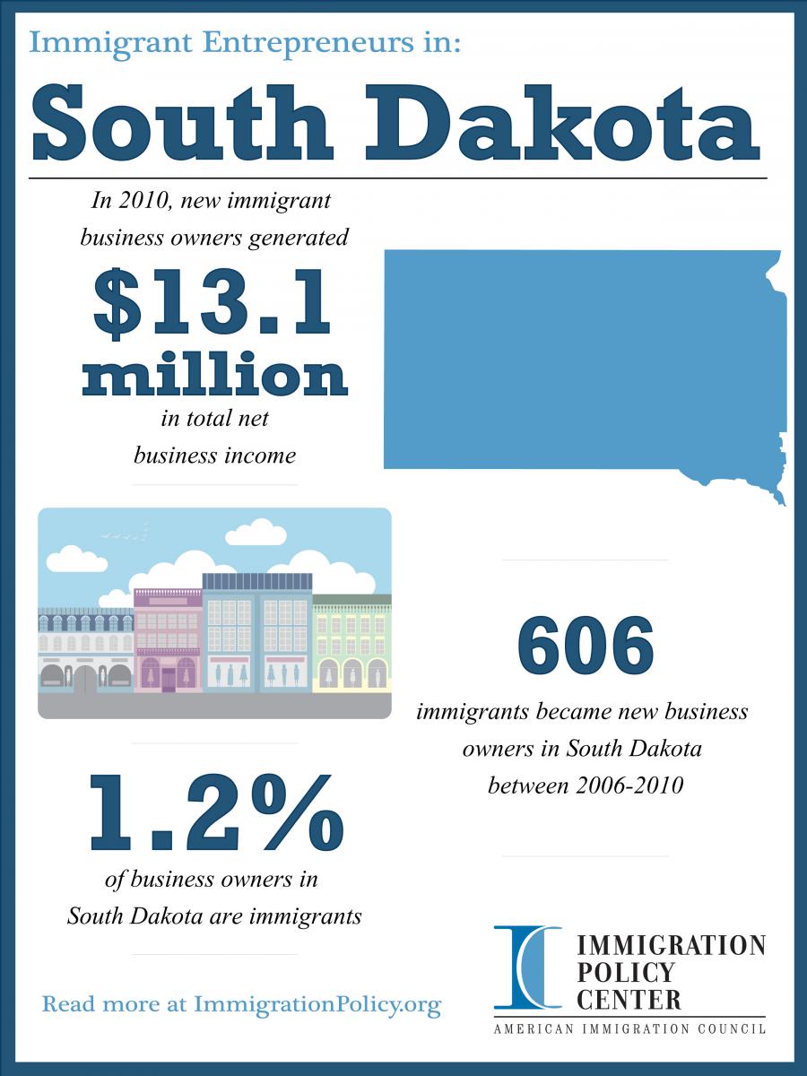 - From 2006 to 2010, there were 606 new immigrant business owners in South Dakota, and in 2010, 1.2 percent of all business owners in South Dakota were foreign-born.