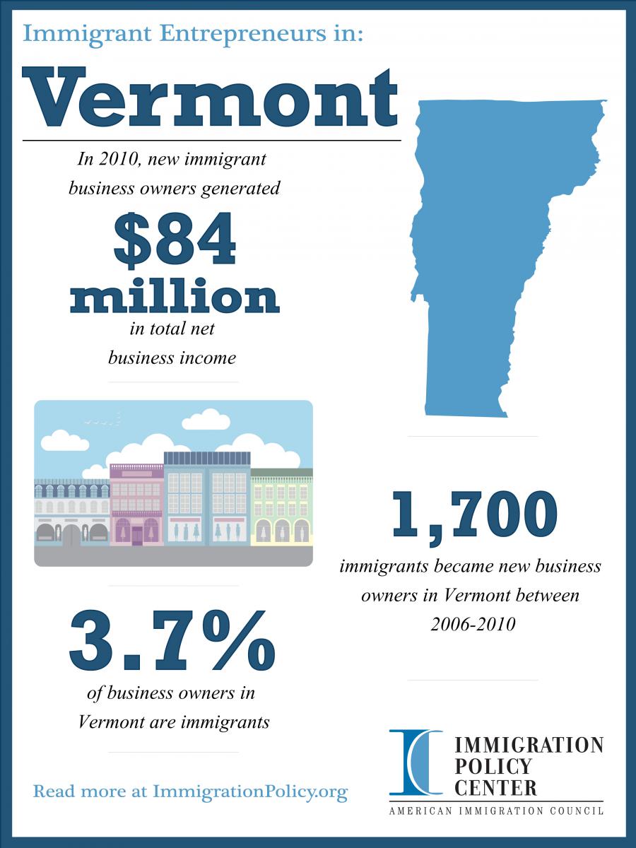 - From 2006 to 2010, there were 1,700 new immigrant business owners in Vermont, and in 2010, 3.7 percent of all business owners in Vermont were foreign-born.