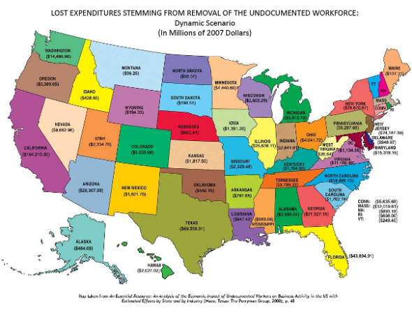 In contrast to FAIR's report, the Perryman Group estimated that if all unauthorized workers and consumers were somehow removed from the U.S. economy, the United States would lose $552 billion in total economic activity ("expenditures"), $245 billion in Gross Domestic Product (GDP), and 2.8 million jobs.