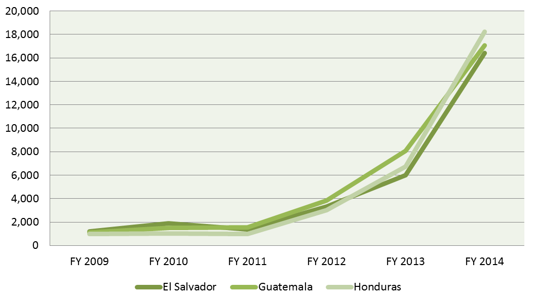 The vast majority of unaccompanied children come from Mexico, Guatemala, Honduras, and El Salvador, although unaccompanied children may arrive from any country. The recent increase in arrivals is due to the migration of children from Guatemala, Honduras, and El Salvador—a region of Central America known as the “Northern Triangle.” According to U.S. Customs and Border Protection (CBP [3]), 68,541 unaccompanied children were apprehended at the southwest border between October 1, 2013, and September 30, 2014. The largest number of children (27 percent of the total) came from Honduras, followed by Guatemala (25 percent), El Salvador (24 percent), and Mexico (23 percent).