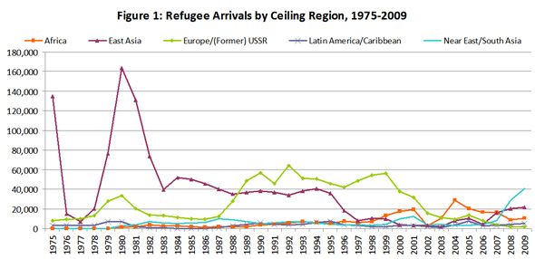 Source: Information for 1975-1989 taken from U.S. Dept. of Health & Human Services Office of Refugee Resettlement, Annual Report 2002 (Cuba and Haiti not included in Latin America); information for 1989-2004 taken from Annual Flow Reports from DHS website; 2005-2009 numbers are taken from the PRM tables of “Arrivals Sorted by Region by Month” for FYs 2005-2010, available at wrapsnet.org.