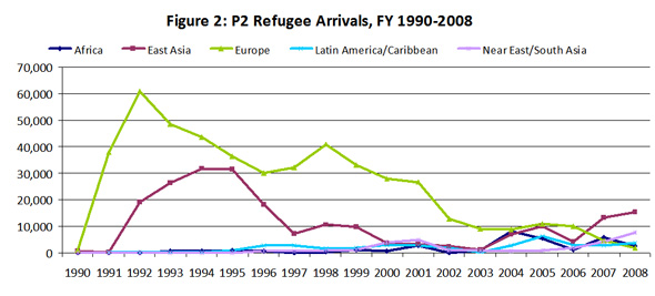 Source: P2 numbers taken from PRM, Office of Admissions, “Arrivals by Case Priority, Fiscal Years 1990-2008, as of August 2008.” provided to researcher by PRM.