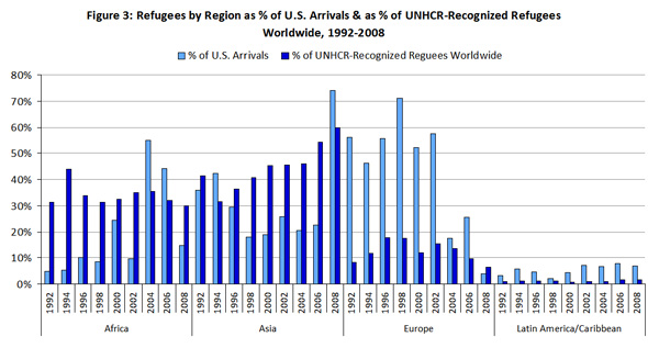 Source: US arrival numbers are taken from the Yearbooks of Immigration Statistics found at the Department of Homeland Security website: http://www.dhs.gov/files/statistics/publications/yearbook.shtm. Numbers for UN-recognized refugees are taken from the UNHCR Statistical Yearbooks at UNHCR website: http://www.unhcr.org/pages/4a02afce6.html. For consistency sake the numbers have been adjusted so that Asian Former Soviet Union (FSU) countries are counted in Europe since until 1999 they were not listed separately but included in the Soviet Union for US data. Data from the US was arranged according to UN regions with the exception of the Asian FSU countries, which have been added to Europe for UN numbers as well so that the comparison is consistent. If these countries had been added to Asia instead (after 1999 when they were separated out), Europe would appear even more heavily overrepresented since Asian FSU countries make up a much smaller percent of US arrivals than they do UN-recognized refugees.